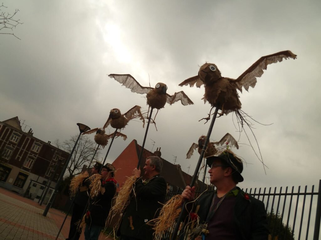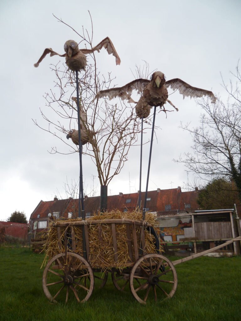 Les ateliers ont été animés par Anne-Gaëlle Ponche et Olivier Mignot de novembre à avril 2015 avec les membres du foyer Singulier-pluriel et les membres de la Pause, à Roubaix. Les ateliers consistaient à la création d’oiseaux et de cages (à base d’armatures de parapluie), à la création de costumes d’épouvantails