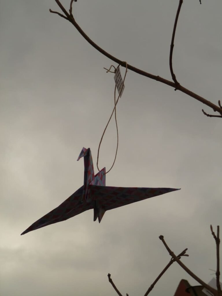 Suspendus à un arbre et distribués aux badauds, les oiseaux de papiers pliés